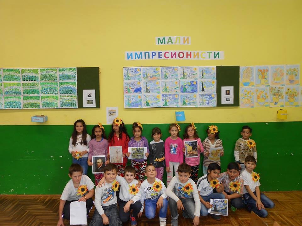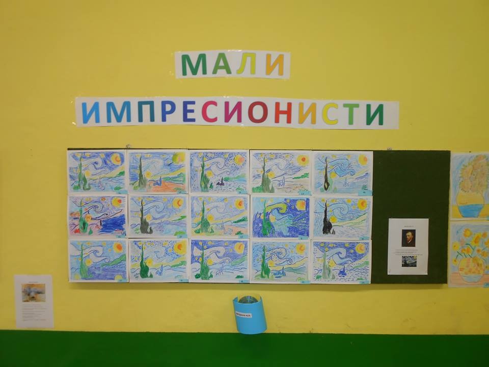 Ученици су приказали репродукције слика великих мајстора: ''Јапански мост'' Клод Моне, ''Звездана ноћ'' и ''Сунцокрети'' Винсент Ван Гог. Радови су настали у оквиру ликовне секције коју води учитељица Јелена Живковић. Ученици су на секцији, поред сликања, учили о животу Клода Монеа и Винсента Ван Гога, уметничким правцима којим припадају и о карактеристикама технике сликања ова два уметника. Ученици су занимљивим програмом показали шта су научили.