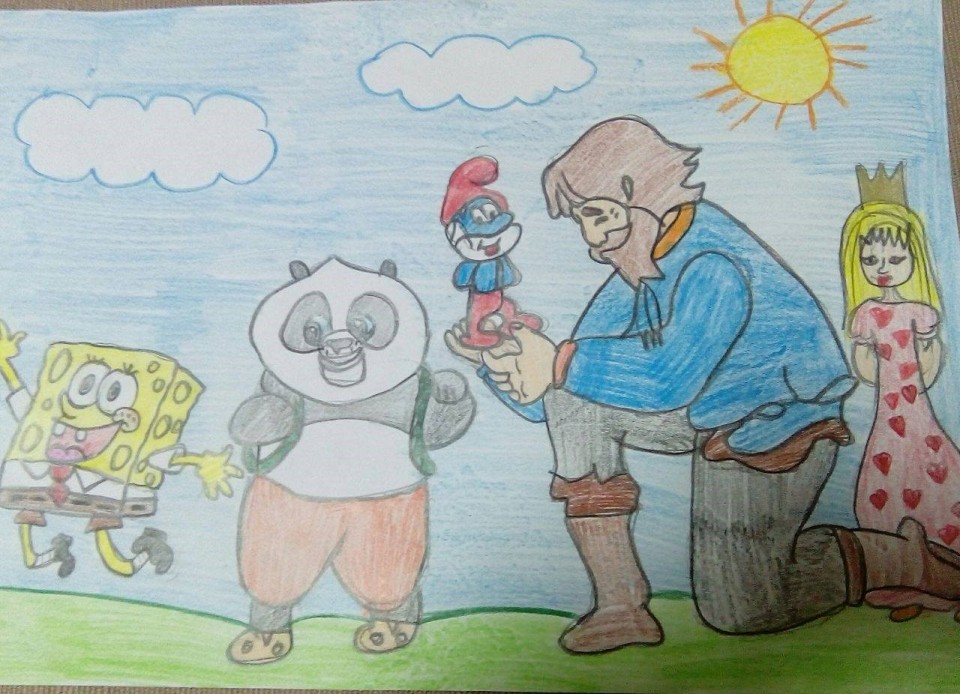 Једнога дана возили су бицикл шумом и наишли на златног зеца. Зец је био плашљив и одмах почео да бежи,али је џин био бржи и ухватио га је. Зец је обећао да ће им испунити једну жељу ако га ослободе. Шта мислите да им је била жеља? Наравно, да добију дечицу. Златни зец је узео златно вретено, замахнуо три пута и појавила су се три детета. Били су мало чудни ,али то родитељима није сметало. Испред њих су стајали Кунг –фу Панда, Сунђер Боб и Велики Штрумф.Дани су пролазили ,а срећна породица је уживала у свом дому. Свако је радио оно што најбоље зна , Велики Штрумф је учио, Панда је вежбао,а Сунђер Боб пекао пљескавице .Били су толерантни један према другом и поред тога што су сви били различити. Док је једног дана тражио информације на лаптопу Штрумф је на Гуглу пронашао Штрумфоград .Породица се преселила тамо и живела срећно до краја живота.